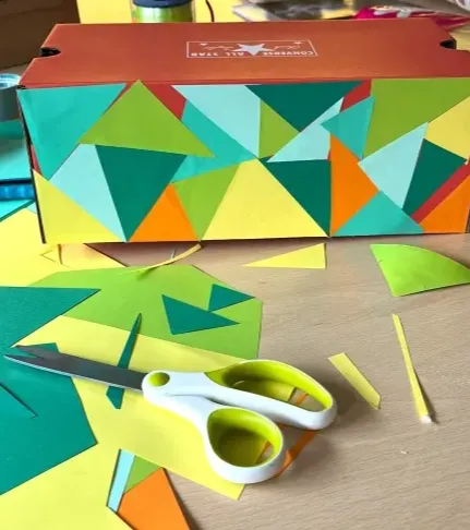 Av en skokartong kan du tillverka en skojbox. Pynta lådan med valfria material så som pappersbitar, fynd från naturen som ni tillsammans samlat, piprensare, glitter, små leksaker...